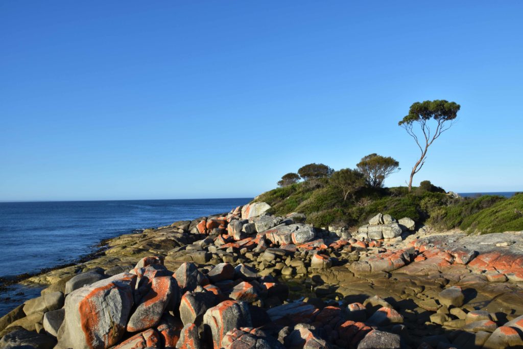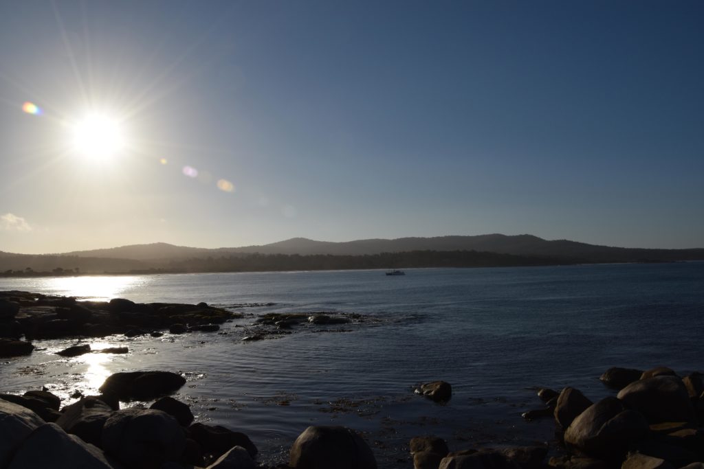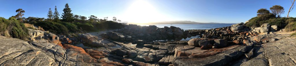 De reden dat we naar St Helens zijn gegaan, was omdat ik graag de Bay of Fires wilde zien. Je ziet enorm veel mooie foto’s op internet van de zonsopkomst/zonsondergang. Ik wil natuurlijk ook zo’n mooie foto maken. Op internet had ik via Google Street View het beste plekje opgezocht zoals op de foto’s. Het is namelijk erg groot daar. Eenmaal aangekomen zag het er mooi uit, maar daar is eigenlijk ook alles mee gezegd. De zonsondergang was een dom idee, omdat de zon volop in de cameralens schijnt. Die internetfoto’s waren dus bij zonsopkomst gemaakt. Het was dan ook een gok.