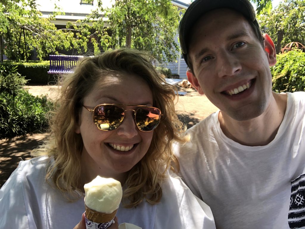 We werden de insecten zat en liepen weer terug naar het begin. We kwamen tot de ontdekking dat onze schoenen erg smerig waren geworden. Ik begon met witte schoenen en nu door die tuin zijn ze oranje geworden. Echt alles zat onder het oranje stof. Om een beetje af te koelen wilde ik wel een ijsje. Ze staan bekend om hun lavendel ijs. Zo kan je puur lavendel ijs nemen, wat een lila kleur heeft. Die pure smaak durfde ik niet aan, dus nam een honing-lavendel-ijsje. Die was op zich wel lekker. Steven die wilde geen ijsje en was er helemaal klaar mee. Dus we gingen maar terug naar St Helens. Overdag hebben we koel in het huisje gezeten. We besloten om vroeg te gaan avondeten, zodat we in de avond naar de Bay of Fires konden gaan bij zonsondergang. Steven had een hamburger met ei gekookt.