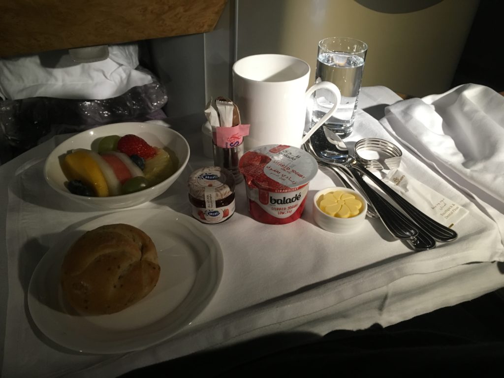 De stoelen zijn heel comfortabel. Je kunt ze volledig laten zakken of in relax stand zetten. Alles helemaal elektrisch. Je hebt je eigen mini bar waar je water en diverse frisdranken staan. Je hebt een kleine ruimte onder het gedeelte voor je voeten en je hebt de overhead lockers. Heel veel ruimte in ieder geval. Die plekken bij het raam hadden ook nog een klein compartiment naast het raam. Hoewel toen ik een ding opende ik de airco unit zag. Je hebt een tablet als tweede scherm en voor je heb je een 32” TV. Tussen Rian en mijn plek zat een plank die je eventueel omhoog kunt doen als je elkaar zat bent of wanneer je elkaar niet kent. Wat ook opviel was dat er veel plekken zijn die gewoon leeg waren. Je kreeg een menukaart met diverse opties voor het ontbijt en het avondeten.