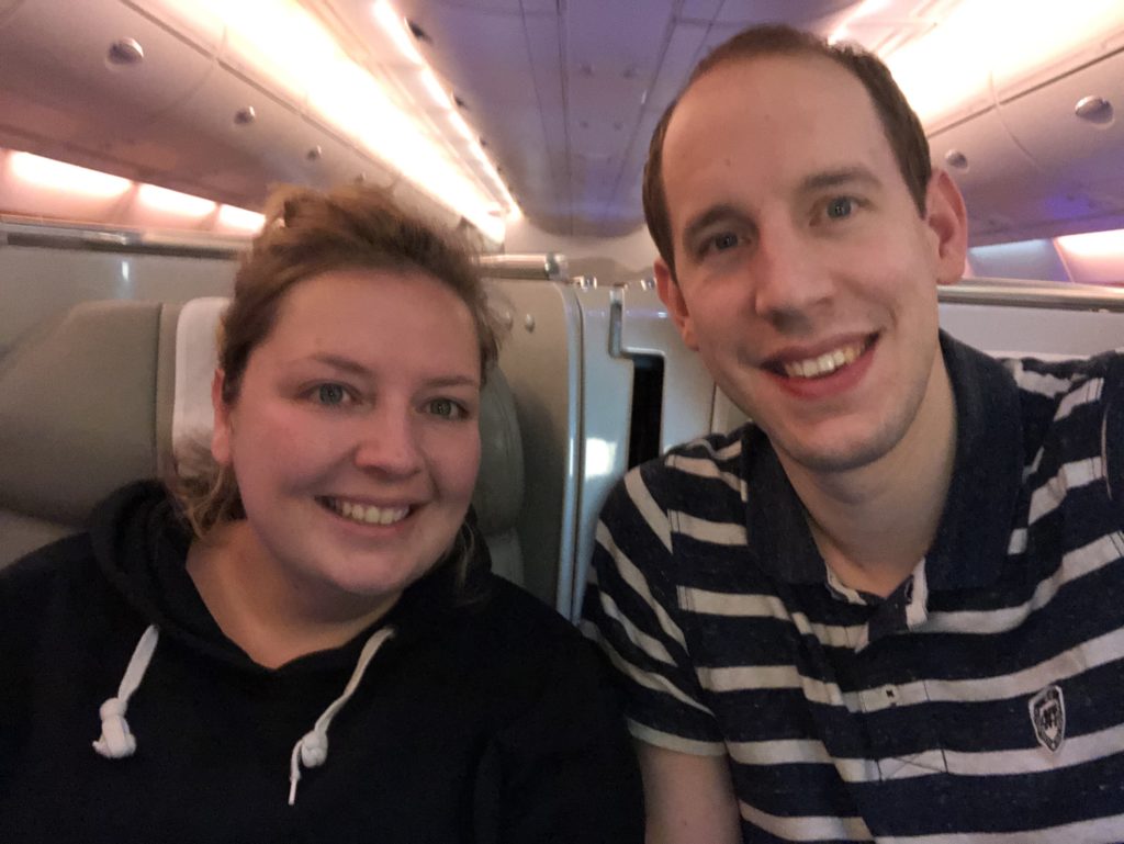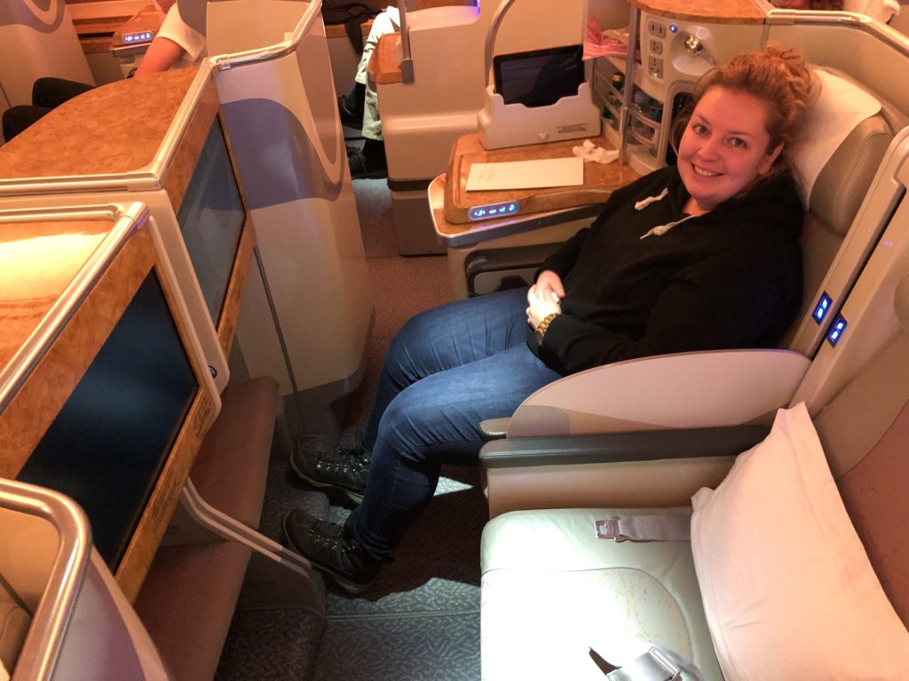 We vlogen tegen de tijd in. Dus het werd redelijk snel weer licht. Maar de meeste mensen lagen nog te slapen en hadden absoluut geen zin om hun raampjes open te doen. Bij economy waren allang alle ramen open gegaan. Maar het is werkelijk de hele reis donker gebleven. Ik heb heel kort het licht gezien toen ik bij een WC ging plassen waar het raam open stond. Toen ik daar stond dacht ik wel dat het niet beter wordt dan wanneer je zit te kakken op 12 km hoogte met een open raampje. Naarmate de reis vorderde werd Rianne steeds zieker. Zeker de laatste 5 uur waren lastig voor haar. Ze werd heel verkouden en was de hele tijd aan het hoesten. Rian is niet gemaakt om zo lang te reizen. Zelf had ik echt nergens last van. Rianne heeft werkelijk alle zakdoeken gebruikt die we in onze handbagage bij ons hadden. Ook de twee pakjes die we van Emirates hebben gekregen heeft ze nodig gehad.