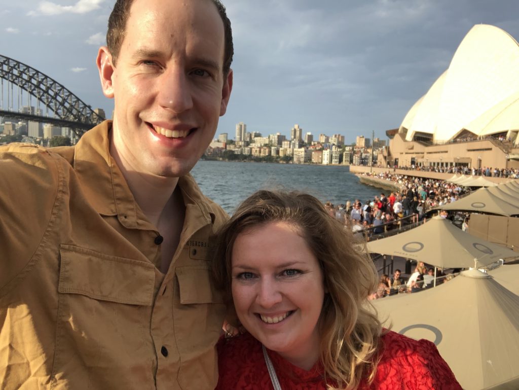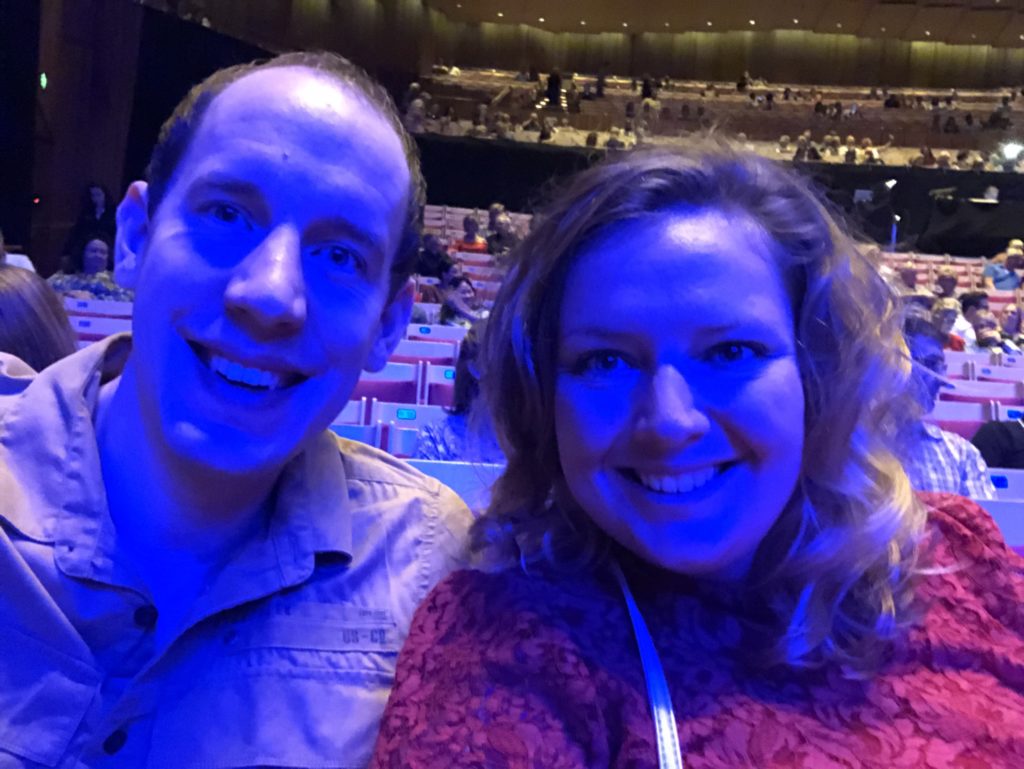We hadden in de supermarkt wat sla gekocht. Dat hebben we voor het concert gegeten en zijn toen vroeg richting The Opera House gegaan. Je ruikt langs het water echt die typische mediterrane zeelucht. Ik vind het lekker, Rianne niet zo. Het was superdruk op de boulevard. Vlakbij het Opera House hebben we nog wat selfies geschoten alvorens we naar binnen gaan. Persoonlijk vond ik het veel kleiner lijken van dichtbij (en lelijker). Binnen kwamen we door een soort security. Het principe geen mannenogen in vrouwentassen kennen ze hier niet ;-). Enfin we waren zo bij de juiste zaal die niet vroeg openging. We zaten praktisch vooraan en een beetje in de hoek. Langzaam druppelden de muziekkanten binnen met hun instrument(en). Ik vond de binnenkant van de zaal wel een beetje tegenvallen. De vloer was een raar type hout en plakte als de neten, het was betrekkelijk klein en het was gewoon een betonnen karkas eigenlijk.