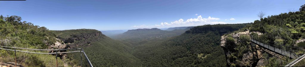 We hadden een redelijk kort ritje voor de boeg van ongeveer 120 kilometer. Dat is ook zo relaxed hier, alles is in meters in plaats van miles en foots. We gaan vandaag richting de Blue Mountains NP. Persoonlijk kijk ik hier heel erg naar uit. Er is echt iets wat mij heel erg aanstaat aan dit soort bergen. We waren vroeg op pad dus het was het al snel op het heetst van de dag. We kwamen bij een pompstation. Het was daar buiten 32 °C. Vervolgens kwamen we aan bij Wentworth Falls. Dat is een kleine waterval met een prachtig uitzicht over de Blue Mountains. Het was erg heet. Eigenlijk gewoon oncomfortabel heet. We hadden gisteren wat broodjes gesmeerd bij het hotel en dus die hebben we gegeten bij een bankje. Het zweet stond me echt op mijn rug. Ik vond het uitzicht echt heel indrukwekkend. Rianne had op dat moment nog niet zoiets van, goh wat mooi. Ik was er echt weg van. Prachtig!