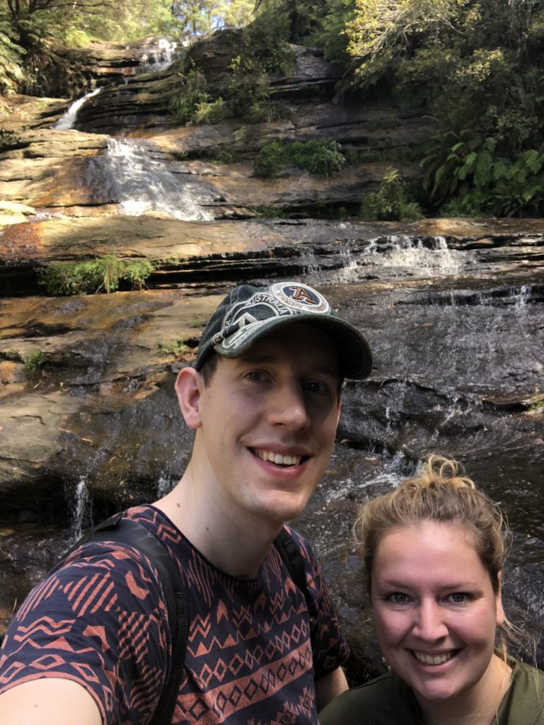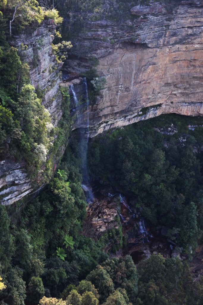 Toen we doorgelopen zijn van bij afgrond, kwamen we bij de Katoomba Falls. Die zijn onderverdeeld in een lagergelegen waterval en de hogergelegen Katoomba Cascades. Het lagergelegen gedeelte hebben we van de zijkant kunnen aanschouwen. Verderop liggen de Katoomba Cascades. Dit is een veel kleinere waterval. Hier kan je onder staan en er foto’s van maken. Het is natuurlijk maar een pisstraaltje wat ervan afkomt maar toch heeft het wat. Het is mooi om te zien. We hebben wat foto’s gemaakt. Hierna zijn we naar boven gegaan. In principe waren we na een kilometer of 4 pas op de helft. Maar het lopen valt niet mee. Er zijn veel hoogteverschillen. Dan loop je weer omhoog dan ga je weer naar beneden. Dat maakt 4 kilometer erg lang. We moesten nog veel verder lopen. In principe tot waar we gisteren waren. De route was zeker meer dan 8 kilometer. Daarom hebben we maar besloten om een andere weg terug te nemen.