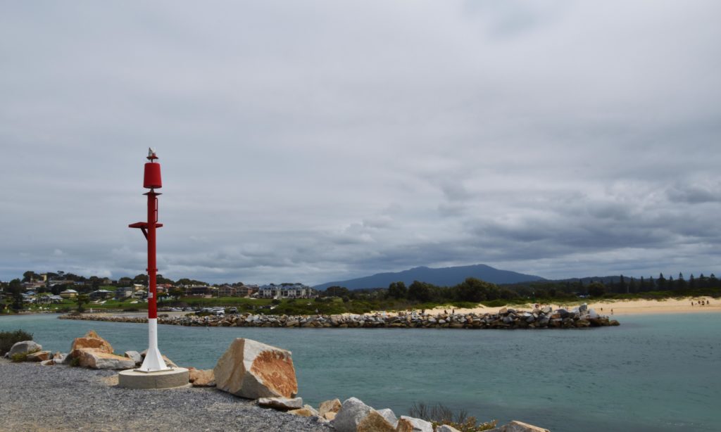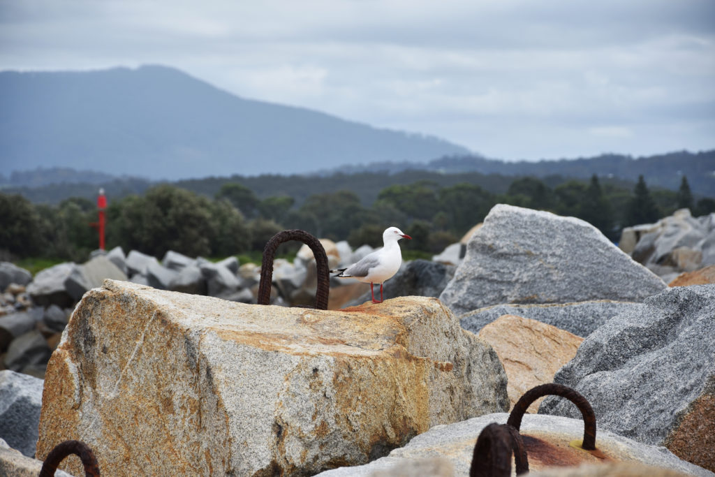We reden verder richting Narooma. Hier is een opening in de rots die de contouren van Australia heeft exclusief Tasmanië. Onderweg kwamen we weer prachtige landschappen tegen. Onwaarschijnlijk mooi. Soms lijkt het wel of je op je kop reed vanwege de wolken. Als je dan omhoog reed had het iets weg van de oceaan. Het was bijna psychedelisch. Eenmaal aangekomen in Narooma konden we de auto makkelijk kwijt. We liepen naar beneden. Het uitzicht was weer wonderschoon. We hoopte op op de afwezigheid van Chinezen. Maar dat leek ijdele hoop. De Australian Rock was wel echt heel mooi. Het lijkt inderdaad heel erg op Australië. Erg leuk om te zien. Toen we verder liepen richting een pier zagen wij de woeste zee. De kustlijn was mooi. Dit land heeft zoveel te bieden qua natuur. We hebben veel foto’s gemaakt bij de pier. Rianne zei toen:”Al hadden we niet alles van tevoren vastgelegd dan had ik hier graag wat langer gebleven”. Zo denk ik er ook over.