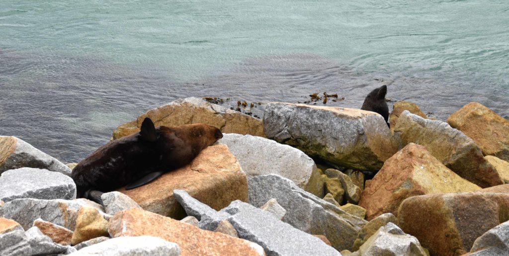 Bij het teruglopen naar de auto zagen we ineens robben of zeehonden liggen. Dat was ook eigenlijk de reden dat we de pier opgelopen zijn, initieel. Ik vond het wel leuk maar het was allemaal niet zo bijzonder als wat we allemaal nog meer meegemaakt hebben. Want als je naar de achtergrond kijkt is die veel bijzonderder. Zeehonden of robben hebben we in Nederland ook.