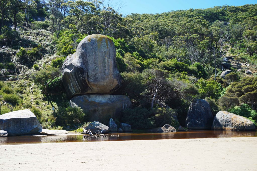 De echte reden dat we hierheen waren gekomen had met de Tidal River te maken. Na even zoeken hadden we dat eindelijk gevonden. Ik was mijn pet vergeten dus mocht ik die van Rianne op. Maar dan verbrandde zij ook op haar hoofd. Heel kut. Uiteindelijk via de auto weer teruggegaan en naar de rots gelopen. Wat viel dat tegen. Het kan wel mooi zijn maar er lagen allemaal mensen in het water voor die rots. Persoonlijk vond ik het een aanfluiting. Rianne vond het wel mooi, maar alleen als er geen mensen waren. Ik vond dat strand echt veel mooier. Nu dit klaar was gingen we op weg naar de Church House op ongeveer een half uur rijden van de Wilson Promontory.